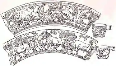 На другом кубке сцена более спокойная. Посередине стоят два быка, которые, повернув друг ко другу головы, как бы ведут между собой диалог. Справа от них изображён третий бык с опущенной головой, отделённый от основной сцены деревом. В другой части композиции расположена фигура человека, который держит веревку, привязанную к ноге четвёртого быка. Животное показывает свое недовольство мычанием и напряжённым движением головы[2].