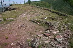 Крепость имеет две линии оборонительных стен, сооружённых из плит песчаника. Первая, внешняя, отсекает подход по седловине от соседней вершины к участку вершины горы размерами 160*170 м. Общая длина первой, внешней стены — 210 м. На момент исследований высота стены доходила до 1,8 м, на сегодняшний день высота стены доходит до 1,5 м, при этом кладка стен прекрасно сохранилась. Внутренняя стена крепости ограничивает небольшой участок вершины, являвшейся цитаделью. Территория между стен имеет сильный наклон и не имеет следов использования, поэтому считается, что внешняя стена возникла не в процессе расширения крепости, а одновременно, как единый комплекс с цитаделью. Внутри цитадели, вплотную к стене, археологически выявлна полуземлянка размером примерно 4 на 15 метров. В западной части так же вплотную к стене пристроены две небольших хозяйственных посторойки или загородки из камня, овальной и подпрямоугольной в плане формы размерами 4×5 м и 4×6 м. Культурный слой построек содержал многочисленные кости животных, фрагменты керамики и вещественные находки. Анализ материалов раскопок не позволяет интерпретировать эти сооружения как бытовые жилые комплексы.