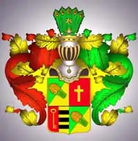 Щит разделен на четыре части, из них первая и четвёртая части, диагонально разрезанные к правому нижнему углу надвое, имеют с правой стороны зелёное, а с левой стороны золотое поля, в которых диагонально же изображено по одному снопу переменных с полями цветов. Во второй части, в красном поле, золотой крест. В третьей части, в правом красном поле, золотой ключ, а в левом золотом поле горизонтально означены три чёрные полосы.