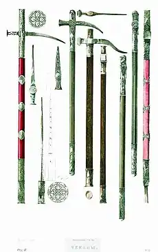 - Алексеев, 2017: «к поллэксам относят холодное оружие с головкой в виде молота, чекана или секиры, позади которой находились клевец, пара шипов [...] или (головка в виде секиры или чекана) молот.».