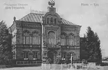 - Здание 4-й гимназии в Киеве по Большой Васильковской улице, 96 (прежде дом 98); главный фасад выходит на переулок, перпендикулярный улице. Возведено в 1897—1898 годах в местности Новое Строение[3]. Включало домовую церковь Св. Николая. Фасады оформлены в духе неоренессанса. В 1920 году пострадало от пожара, но было восстановлено и использовалось как помещение средней школы, впоследствии — ведомственное учебное заведение КГБ и СБУ.