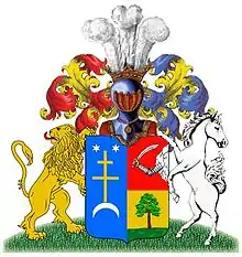 В щите, разделённым перпендикулярно на двое, в правом голубом поле над серебряною луною, рогами обращёнными вниз, изображён длинный патриарший шестиконечный золотой крест с двумя перекладинами, из которых верхняя малая, а нижняя большая. Над крестом расположены две серебряные шестиконечные звезды. В левом верхнем красном поле видна из облаков выходящая в латах согнутая рука со шпагою, а внизу в золотом поле находится дерево дуб.