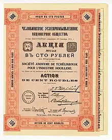 Челябинское углепромышленное акционерное общество было зарегистрировано в Санкт-Петербурге в 1911 г. (Устав Высочайше утвержден 22 сентября 1911 г.) для промышленной эксплуатации угольных рудников, расположенных к востоку от Уральского хребта. Основной капитал компании определялся в 1 млн. руб. разделенных на 10 тыс. акций по 100 руб. каждая.[3]