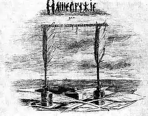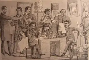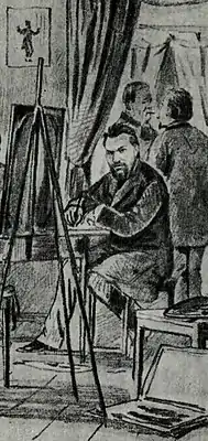 ![]() М. Чемоданов в редакции «Будильника». 1885. Рис. Т. Симова | |