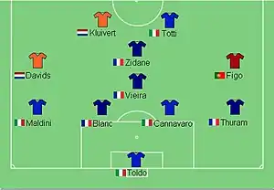 - В плей-офф разыгрались ещё несколько драм. В четвертьфинале Югославия была разбита со счётом 1:6 командой Нидерландов, потерпев крупнейшее поражение в финальной части Евро. На той же стадии Испания упустила самый реальный шанс остановить сборную Франции: на последних минутах игры легендарный Рауль Гонсалес не забил пенальти французам. Португалия и Италия уверенно справились со своими противниками.