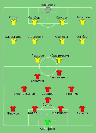 Российские футболисты начали матч активно и открыли счёт: на 24-й минуте Константин Зырянов отдал пас Александру Анюкову, тот передал мяч Роману Павлюченко, который в касание забил гол. На 27-й минуте Хенрик Ларсон головой отправил мяч в перекладину, и всю вторую половину первого тайма инициативой владели шведы. Вскоре после начала второго тайма на 50-й минуте Юрий Жирков прошёл полполя и отдал мяч Андрею Аршавину, удвоившему счёт. Затем был ещё ряд опасных моментов у обоих ворот, но в итоге матч закончился со счётом 2:0, позволившим сборной России выйти в четвертьфинал.