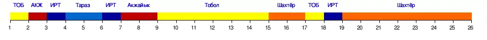 | 4 | Тараз | 26 | 14 | 4 | 8 | 32 − 30 | +2 | 46 | |