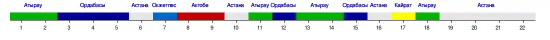 | Атырау | 1:1 | 0:2 | 0:0 | 1:1 | 2:1 | 1:0 | 1:2 | 3:0 | 0:0 | 2:1 | 2:1 | |