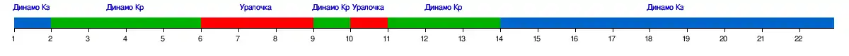 | 12. «Самородок» | 3:1 | 1:3 | 1:3 | 1:3 | 0:3 | 0:3 | 0:3 | 2:3 | 2:3 | 1:3 | 1:3 |