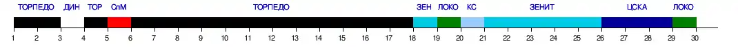 | Торпедо | 1 | 1 | 2 | 1 | 2 | 1 | 1 | 1 | 1 | 1 | 1 | 1 | 1 | 1 | 1 | 1 | 1 | 2 | 4 | 5 | 5 | 5 | 5 | 6 | 5 | 5 | 5 | 4 | 5 | 5 |