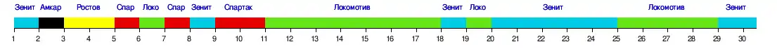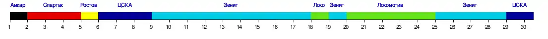 | 11 | Ростов | 30 | 10 | 6 | 14 | 43 − 47 | −4 | 36 |