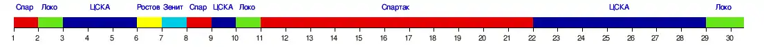 | 6 | Спартак | 30 | 15 | 5 | 10 | 46 − 36 | +10 | 50 | |