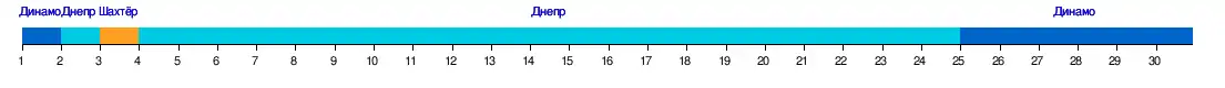| 2 | «Днепр» | 1:0 | 3:1 | 3:1 | 2:1 | 1:0 | 4:1 | 0:0 | 2:0 | 3:0 | 2:0 | 5:1 | 3:1 | 3:1 | 4:0 | 4:1 | |