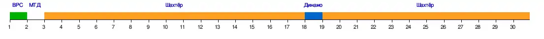 | 1 | «Шахтёр» | 3:2 | 3:0 | 2:0 | 4:1 | 1:0 | 1:0 | 3:1 | 3:0 | 2:1 | 0:1 | 1:0 | 4:2 | 1:0 | 5:2 | 2:0 | |