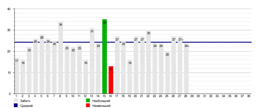 | Сент-Этьен | 15 | 14 | 11 | 7 | 4 | 3 | 2 | 2 | 5 | 4 | 5 | 4 | 5 | 7 | 5 | 7 | 6 | 7 | 6 | 7 | 5 | 6 | 8 | 5 | 4 | 4 | 4 | 7 | 7 | 8 | 7 | 6 | 6 | 5 | 5 | 4 | 5 | 6 |