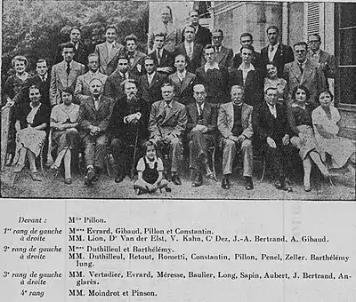 Участники и организаторы 13-го чемпионата Франции и их жены. Сидящая девочка: м-ль Пийон; 1-й ряд: г-жа Эврар, г-жа Жибо, Лион, ван дер Элст, В. Кан, Дез, Ж.-А. Бертран, А. Жибо, г-жа Пийон, г-жа Константен; 2-й ряд: г-жа Дютийоль, Дютийоль, Рету, Н. Рометти, Константен, Пийон, Пенель, Целлер, Бартелеми, г-жа Бартелеми, Л. Юнг; 3-й ряд: Вертадье, Эврар, Мересс, Болье, Лонг, Сапен, Обер, Ж. Бертран, Англаре; 4-й ряд: Муандро и Пинсон