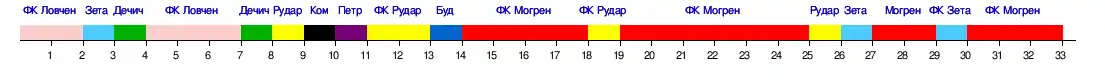 | 1 | ФК Будучност (2) | 33 | 18 | 12 | 3 | 43 − 13 | +30 | 66 | Первый квалификационный раунд Лиги чемпионов |