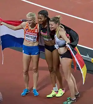 | 3 | Анук Веттер | 13,31 | 1,77 м | 15,09 м | 24,36 | 6,32 м | 58,41 м | 2:19.43 | 6636 | NR | |