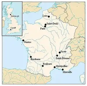 В самой Франции использовались те же стадионы, на которых в 1998 году прошли матчи чемпионата мира по футболу. В организации матчей приняли участие около 6 тысяч волонтёров[17]. При этом матчи чемпионата мира не первый раз проходили во Франции: в 1991 году матчи группы D прошли во французских городах Безье, Байонна, Гренобль, Тулуза, Брив и Ажен, а на стадионах «Парк де Пренс» и «Лилль-Метрополь» прошли четвертьфиналы. В 1999 году матчи группы C прошли в Безье, Бордо и Тулузе, дополнительный матч плей-офф состоялся на стадионе «Феликс Болларт», а на «Стад де Франс» прошёл четвертьфинал[18].