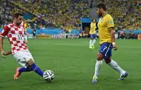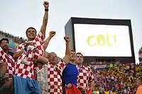 | Болельщики сборной Хорватии радуются голу (автоголу), забитому в ворота бразильцев | Неймар при исполнении штрафного удара | Удар Марсело по воротам Стипе Плетикосы | Дарио Срна против Халка |