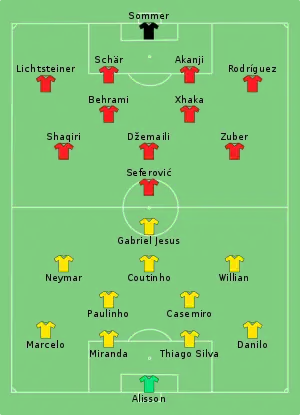 - Tactical Line-up – Group E – Brazil-Switzerland (PDF). FIFA.com. Fédération Internationale de Football Association (17 June 2018). Дата обращения: 17 июня 2018.