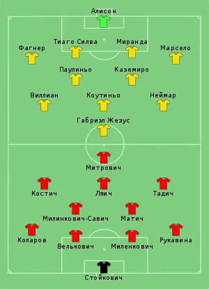 - Tactical Line-up – Group E – Serbia v Brazil (англ.). FIFA.com. Fédération Internationale de Football Association (27 июня 2018). Дата обращения: 28 июля 2018.