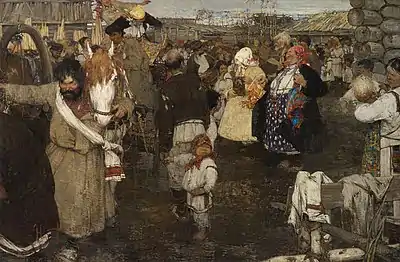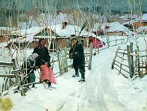 Кусочек подлинной, глубокой России представляет собой это серое пустынное село, эта сцена, погружённая в грязь и винные пары! Неприглядная правда! Но правда, которая и не имеет притязания на приветливость, а хочет быть горькой, неприкрытой истиной. Яркие кричащие краски некоторых одежд и над избушками лёгкое дыхание весны, чуть появляющейся на общем фоне, ещё более подчеркивает убогую пустыню остального, а своеобразно сухое и жёсткое письмо прекрасно подходит к характеру всей картины