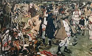 - Желание показать языческую дикость, роднящую человека с природной стихией и его этническими корнями. Ни один отдельный персонаж не является главным на этих полотнах, все они — отдельные, самостоятельные, но лишь элементы общего «действа»[103].
