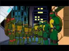 Этими огромными черепахами оказываются Черепашки-ниндзя из вселенной мультсериала 1987 года. Но они попадают в руки Хану и Пурпурным Драконам. Тогда Черепашки (те которые из мультсериала 2003 года) спасают своих собратьев. Оказывается, они попали в измерение Черепах 2003 через портал на технодроме.[1] В качестве мести Хан решает убить Черепашек, но, разрушив убежище и похитив Сплинтера, он упускает восьмерых Черепашек, так как те переместились во Вселенную Черепашек 1987 года.