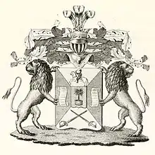 В скошенном справа и слева щите в центре червлёный малый щиток, в котором пальмовое дерево в золотой кадке. В верхней части в золотом поле скачущий на серебряном коне ездок, а внизу две шпаги, положенные накрест и обращенные остриями вверх. В боковых частях, в лазоревом поле два золотые свитка. Щит увенчан дворянскими шлемом и короной. Нашлемник: три страусовых пера. Намёт золотой, подложенный червленью и лазурью. Щит держат два льва.