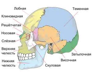 Череп человека (лат. cranium) — костный каркас головы, совокупность костей. Череп человека сформирован 23 костями (из которых 8 — парные и 7 — непарные), помимо которых в полости среднего уха присутствует ещё три парные слуховые косточки — молоточек, наковальня и стремя, а также 32 (28, 20; 4 х 8, 7 или 5) зуба на верхней и нижней челюстях.