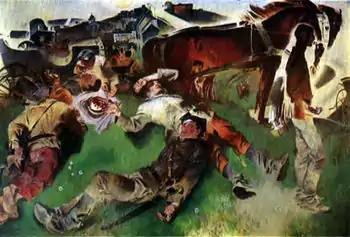 Для своего сюжета художник выбирает самый мирный, даже идиллический, на первый взгляд, её эпизод. Бойцы словно забыли о всегда близкой смерти[10]. В их руках не шашки, а спелые ягоды черешни[11]. Художник разместил главных героев на вершине холма и разделил композицию на отдельные сцены с определённым содержанием так искусно, что совершенно не ощущается переход от внешнего описания к лирическому размышлению[2]. В круговом расположении их фигур безмолвная связь, круг дружбы. Они ещё совсем молоды, старшему не больше двадцати, но в их лицах мы видим твёрдость и мужество[12]. Передний и задний план поставлены в различные временные ситуации. В сжатом пространстве дальнего плана виднеется мирная жизнь городов и сёл, она принадлежит времени мечтательных помыслов бойцов[13]. Сам автор объяснял свой замысел[14]:
