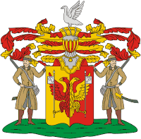 Описание герба: Выдержка из Общего гербовника Щит разделен перпендикулярно на два поля, золотое и красное, в коих находится двуглавый орёл с распростёртыми крыльями, переменных цветов с красного на золото, держащий в лапах два прапора с изображением на каждом из них литеры P. Щит увенчан серебряным шлемом с баронской на нём короной, на поверхности которой виден стоящий гусь, обращённый в правую сторону. Намёт на щите красный, подложенный золотом. Щит держат два вооружённые мужа, имеющие одеяние подобное донским казакам. |