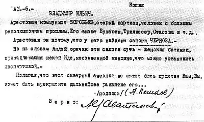 В 1920 году Максим Горький написал письмо В. И. Ленину с просьбой освободить старого коммуниста Воробьёва, которого арестовали за то, что у него дома были якобы найдены сапоги В. М. Чернова. По словам Горького, на самом деле это были не сапоги, а женские ботинки, и к Чернову они никакого отношения не имели.