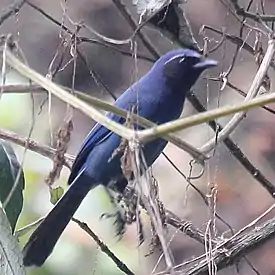 Длиной до 34 см, массой до 210 г. Птица тёмно-синяя с чёрной головой, телосложением похожа на сороку.