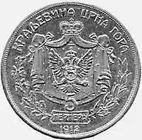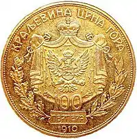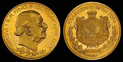 4 мая 1909 года указом князя Николы I объявлено о введении национальной денежной единицы — перпера. В том же году были отчеканены монеты в 1 и 5 перперов. В 1910 году последовала монета номиналом в 2 перпера. Золотые 10 и 20 перперов были также выпущены в 1910 году, вместе с ограниченной партией монет достоинством в 100 перперов[1].