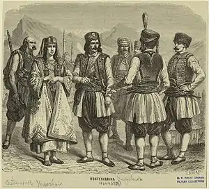 Мужская одежда состояла из белой рубахи, заправлявшейся в синие шаровары до колен (черног. димије), опоясанных широким шёлковым поясом, гетр (черног. докољенице), жилетов-безрукавок (черног. јелек, џока), душанки (черног. душанка) — куртки с откидными рукавами, суконного пиджака (черног. капут) или куртки (черног. гуњ) и длинного суконного кафтана (черног. долама). Как правило, душанки носили молодые юноши и мужчины, а кафтаны-доламы — пожилые. Женщины носили длинную туникообразную белую рубаху, поверх неё — юбку (черног. сукња, раша), опоясанную кожаным ремнём с медной бляхой (черног. ћемер), передник (черног. прегача), вязаный или шерстяной жакет (черног. јакет), по праздникам — шитый золотом жилет с короткими рукавами (черног. долактица) и длинное распашное платье из белого сукна и без рукавов, украшенное на углах и по краям (черног. корет). Зимой оба пола носили струку (черног. струка) — длинный плащ с капюшоном, который помимо своей основной функции — защиты от осадков мог служить в качестве одеяла-пледа. Головным убором служила капа — круглая фетровая шапочка с чёрным околышем и красной тульёй, вышитой золотыми нитями; мужчины также носили меховые шапки, украшенные перьями, а замужние женщины надевали поверх капы убрус-мараму (черног. марама). Обувью служили опанки — кожаные башмаки, надеваемые на носки (черног. чарапе), у мужчин — также сапоги, зимой пастухи и охотники носили деревянные снегоступы (черног. крпље). Схожие костюмы носило население приграничных областей Сербии, Герцеговины (юго-восток современной Боснии и Герцеговины) и хорватской Далмации[10][11].