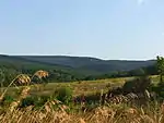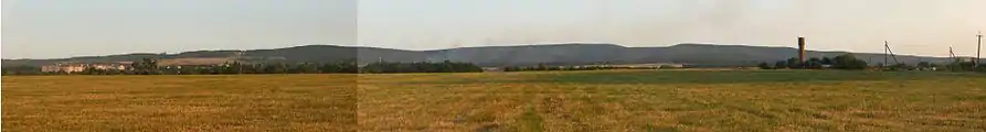 Панорама гор в окрестностях пос. Черноморского: справа - Песчаный хребет (урочище Волчьи Ворота), слева - хребет Длинная Гора