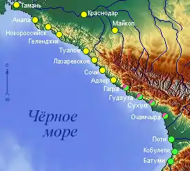 Черноморское побережье простирается более чем на 600 км, около 350 из которых относятся к его российскому участку. Наиболее значительными городами региона являются (с севера на юг): Анапа, Новороссийск, Геленджик, Туапсе, Лазаревское, Сочи, Гагра, Пицунда, Гудаута, Сухуми, Очамчыра, Поти, Батуми. Кроме того, курортное значение имеют Кабардинка, Дивноморское, Архипо-Осиповка, Джубга, Лермонтово, Новомихайловский, Абрау-Дюрсо, Дагомыс, Мацеста, Хоста, Лоо, Адлер, Новый Афон, Гулрыпш, Анаклия, Ганмухури, Кобулети, Махинджаури, Гонио, Сарпи, Вардане, Цихисдзири и Чакви.