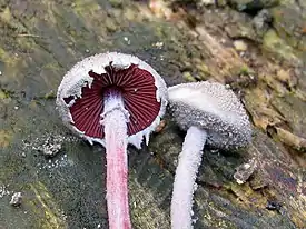 Плодовые тела шляпконожечные. Шляпка в молодом возрасте полностью покрыта общим покрывалом, затем с его остатками по краю, тонкомясистая, колокольчатой или выпукло-колокольчатой формы. Гименофор пластинчатый, окрашен в яркие винно-красные или сине-зелёные тона, при высыхании темнеет до бурого или чёрного. Пластинки частые, не приросшие к ножке, с ровным краем.