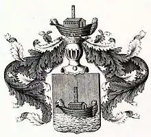 Описание герба: Выдержка из гербовника[1] В щите, имеющем красное поле, изображен плывущий по реке Ноев ковчег зелёный, и на нём посередине зелёный столб наподобие башни, а на носу и на корме золотые львиные головы. Щит увенчан обыкновенным дворянским шлемом с дворянской на нём короной, на поверхности которой виден означенный в щите ковчег. Намёт на щите красного и зелёного цвета, подложенный серебром. |