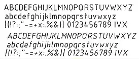 Расстояния между буквами и цифрами делают вдвое больше толщины линии, то есть равными 2d. Расстояния между словами и числами делают такими, чтобы в них могла поместиться буква O, то есть равными 6d. Расстояния между нижними границами строк делают равными 17d.