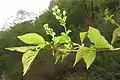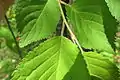 Форма резко заостряющихся к вершине листьев эллиптическая или обратнояйцевидная, размер 4—9 см на 2—5 см. Основание клиновидное, иногда закругленное. Края крупнотроякозубчатые или крупнодвоякозубчатые, на верхушках зубчиков коричневые узкие эллипсоидальными желёзки с рассеянными с адаксиальной (верхней) стороны листа короткими трихомами, наиболее заметными вдоль главной жилки. Абаксиальная (нижняя) сторона листьев вдоль жилок волосков не имеет. Опушенный белыми длинными волосками черешок имеет длину 1—1,5 см. Прилистники ланцетно-линейные, длиной около 5 см, с каждой стороны имеется несколько железистых зубцов[2].