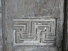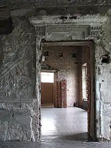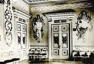 Ритмическое членение пространства стен обеспечивали широкие пилястры упрощённого дорического ордера, которые содержали барельефы, изображавшие пучки ликторских связок с секирами и шлемами. Пучки были перевиты позолоченными лентами. Композицию дополняли тоже позолоченные трёхчастные лавровые венки и лепные медальоны в верхней части пилястр, с профилями античных воинов[10][24].