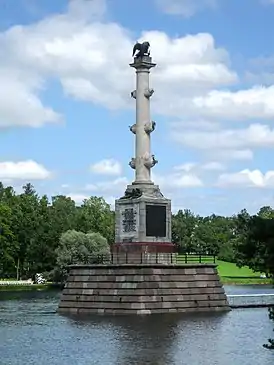 Колонна на Большом пруду, посвящённая победе в Чесменском сражении, также называлась Орловской[16][17] — в честь графа А. Г. Орлова[19], командующего русским флотом в Архипелагской экспедиции и победителя турок при Чесме, и Большой Ростральной[7], чтобы отличать её от Малой Ростральной — Морейской колонны, установленной в регулярной части парка, у каскада прудов[20][21].