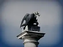 На капители колонны — скульптура орла из тёмной бронзы, отлитая И. Г. Шварцем. Голова птицы с хищно открытым клювом повёрнута на восток, в правой лапе он держит полумесяц — символ османской Турции[42]. На пьедестале у подножия колонны размещены литые бронзовые (либо чугунные) композиции из перекрещивающихся вёсел и якорей, обвитых цепями[16][41]. А. С. Пушкин в своём стихотворении 1814 года «Воспоминания в Царском Селе» так писал об этих скульптурных украшениях: