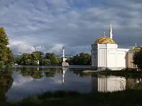 В эту же группу входят Башня-руина архитектора Ю. М. Фельтена в память о победах русской армии над турками, выстроенная после начала войны[21][23], Красный (Турецкий) каскад, устроенный на Верхних прудах в 1770-е годы (архитектор В. И. Неелов, инженер И. К. Герард) и тоже выступающий в качестве своеобразной отсылки к войне с Турцией[24][25], и Турецкий киоск И. В. Неелова, который был построен в конце 1770-х годов после дипломатических успехов князя Н. В. Репнина в Османской империи и до наших дней не сохранился[26][27].