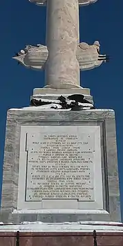 По четырём сторонам пьедестала оформлены филёнки, по форме тоже квадратные (со стороной «в полтора аршина»). С юго-западной стороны внутрь филёнки вмонтирована мраморная доска с памятной надписью накладными жёлтыми металлическими буквами (латунными[15] или медными)[11][16]. Надпись гласит: