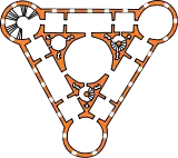 Дворец в плане представляет равносторонний треугольник (каждая сторона около 40 м.), углы которого решены в виде башен, последние завершаются фонарями с полусферическими куполами. Помещения располагаются по периметру здания. В образовавшийся внутренний треугольник вписан круг — Парадный зал второго этажа. Внешние стены дворца, возвышаясь над массивом всего здания, образуют своеобразную зубчатую корону. Первоначально нижний этаж был обработан рустом, выше же оставалась обнажённой кирпичная кладка стен. Массивный объём дворца, прорезанный по фасаду стрельчатыми проёмами окон в два яруса, должен был ассоциироваться с суровыми рыцарскими временами.