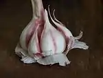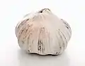 Луковица сложная, образует в пазухах своих чешуй от 2 до 50 луковичек-«деток» (именуемых в обиходе «зубками» или «зубчиками»)[9], каждая из которых покрыта жёсткой кожистой чешуёй[10]. Луковица округлая, несколько приплюснутая, к середине овально-ребристая. Луковицы могут быть белые, желтоватые, тёмно-фиолетовые, розово-фиолетовые. С помощью луковичек чеснок размножается вегетативно, что и используется в культуре[9]. Внешние луковички продолговатые, к середине утолщённые; наружная поверхность выпуклая, внутренняя — вогнутая.